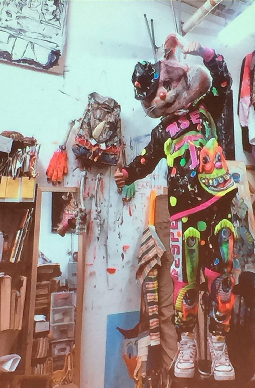 What struck me when I first saw him was his clothing. Being a unique artist, it’s not too surprising that his personal style would be as creative as his works. For the interview, he was wearing a custom suit stitched by Antwerp 6 designer, Walter Van Beirendonck, using themes and references from Scooter’s art. Apparently, the suit itself was in demand even by art collectors, but LaForge chose to keep it for himself. On the table in front of him were two of his custom designed baseball caps, painted and adorned with random items. For example, random screws he found on the streets of New York.